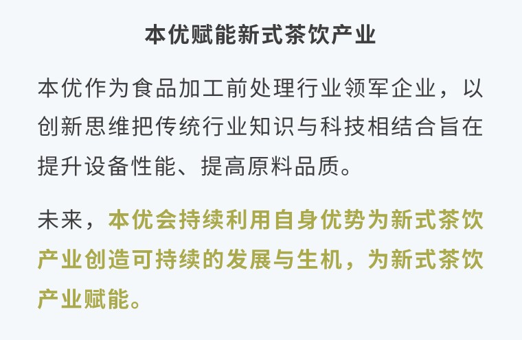 本優機械緊跟時代潮流,關注消費者需求,響應客戶號召,除在傳統奶茶領域成熟交付的珍珠粉圓加工生產設備以外,在新茶飲領域已成功交付包括水果加工(原果處理、凍果塊處理)、果漿加工、谷物燕麥紅豆加工、寒天晶球加工、椰果加工、風味凍加工、椰乳加工等一系列新式茶飲重要原料加工生產線。