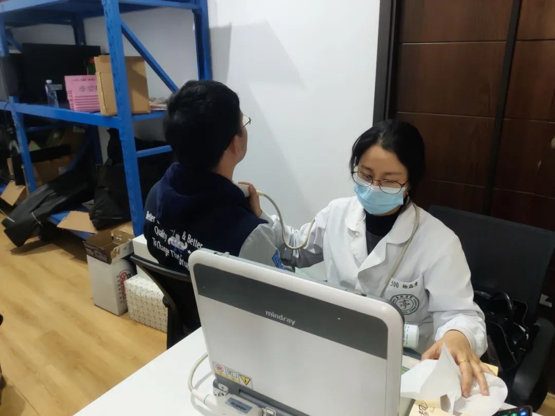 活動現場,醫生們為公司員工提供甲狀腺B超、血壓測量、中醫等服務。