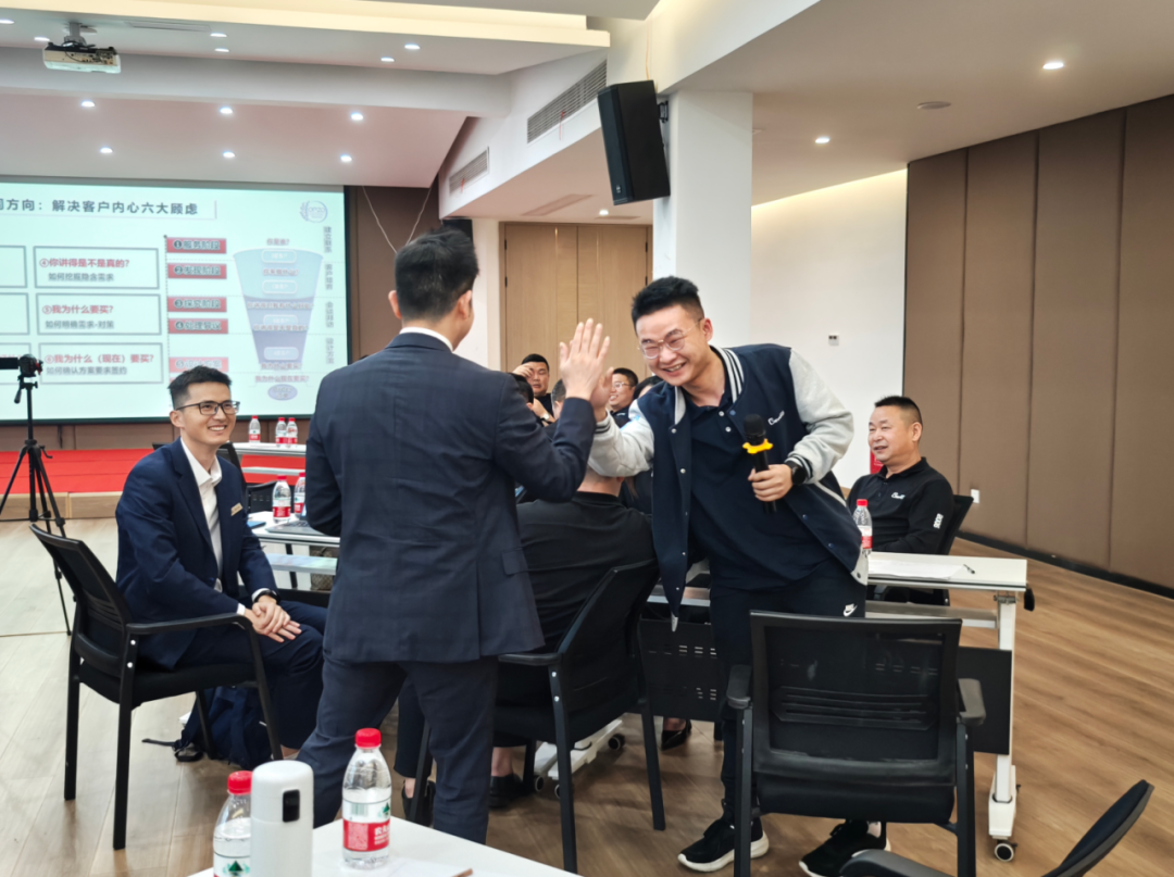 培訓老師風趣幽默的講了金牌銷售的成長體系,現場氣氛活躍,小伙伴們熱情高漲,紛紛認真記錄拍照,根據培訓內容,進行平時銷售流程中實際問題的討論。